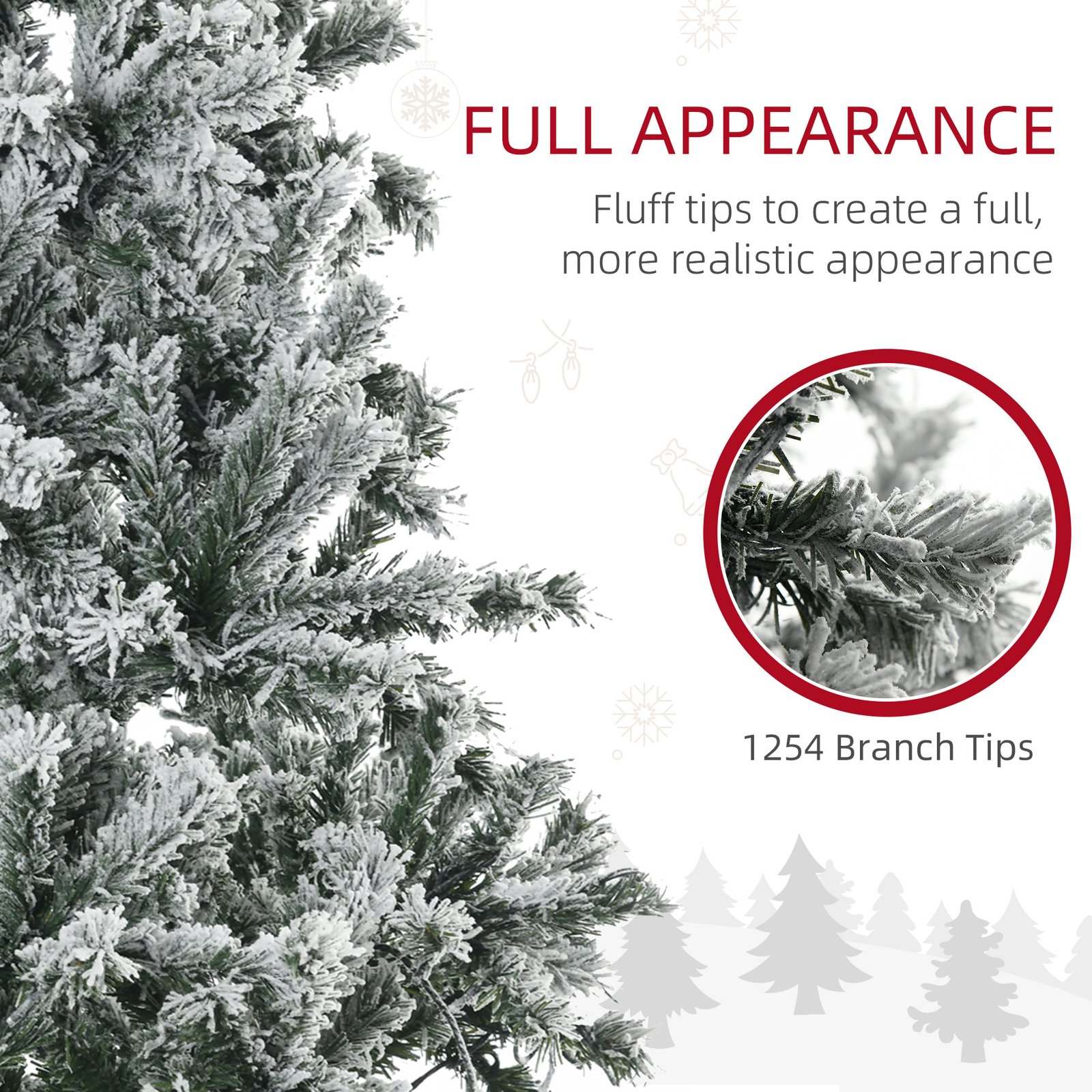 HOMCOM’s Christmas tree with lights gets you all the ambience the holiday brings without any of the mess the holiday brings. Spending time together with friends and family is really what Christmas is all about, and your tree is something you shouldn’t have to mess with (ugh). Our HOMCOM lighted Christmas tree will help take some of the hassle out of the holiday. Little mess, simple assembly, and impeccable ambience help make your season just a little brighter. Features: – 7.5ft tall, provide a healthy, natural look – Sprayed with artificial snow to add wintry appearance – Cold white LED lights consume little energy and are cool to touch – Hinge construction, section design, branches being opened automatically for quick setup – Flame retardant branches are unlikely to catch fire or cause serious household damage – Sturdy steel base keep the tree upright Specification: – Color: Green – Light Color: Cold White – Material: Plastic, Steel – Overall Dimension: Dia. 47.25″ x 90″ H – Tree Height: 7.5 ft – Cord Length: 6.6 ft – Tip Count: 1254 – Light Count: 500(LED) – Input: 120 V, 60 Hz – Output: 30 V, 200 mA, 6 W – Item Label: 830-721V81GN Note: Only for indoor use, not for outdoor In order to get a full appearance, please spread out all individual tips to get the best possible look from the tree, suggest you to take 40-60 minutes to shape the tree. Package Includes: – 1 x Christmas Tree – 1 x Manual.