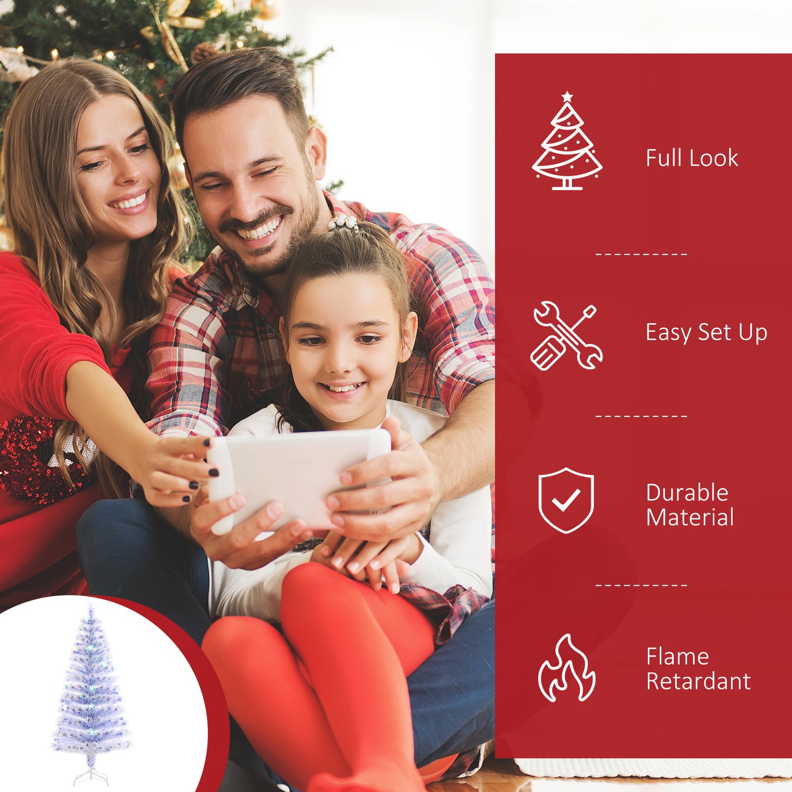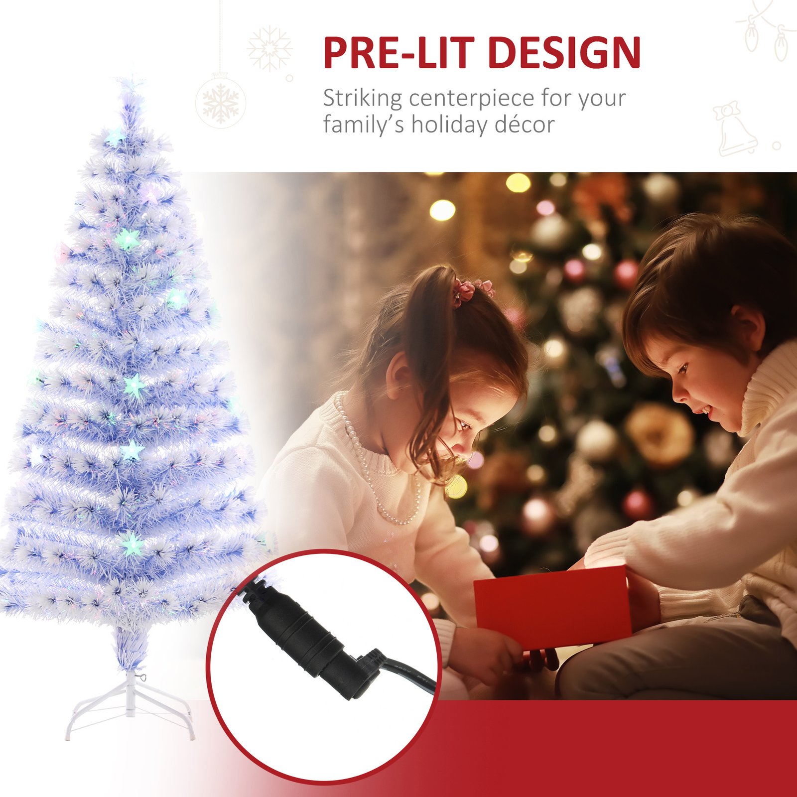 This holiday season, spend more time celebrating and less time maintaining and cleaning up with this 5 ft Tall Pre-lit, Artificial White Christmas Tree from HomCom. With this particular model you get built in multi-color fiber optics and LED stars that complement each other in a beautiful sparkling display to give off an authentic holiday feel. Each fiber optic branch twinkles with seven beautiful colors and eight preset modes to create a striking lighting display that really makes this tree the centerpiece of the holiday. Features: – Full 5 ft tall white artificial Christmas tree – Fiber optic and LED lighting built right into the tree provides a dazzlingly display – Beautiful pre-set light patterns for creative holiday twinkling – Multi-color fiber optic sprigs nicely complement LED star lights – Balanced branch structure for hanging ornaments – Includes a star topper attached to the tree for the perfect finishing touch – Includes a base for additional structural integrity – Hinged branches make disassembly and storage quick and easy Specification: – Type: Artificial Christmas Tree – Colors: White/Blue Tree, Multi-Color Fiber Optics/ LEDs – Materials: PVC Branches, Steel Base – Overall Dimension: Φ27.5″ x 60″H – Tree Height (Including Star and Stand): 5 ft Tall – Tip count: 180 Branches – Light Count: 21 LED Lights – Voltage: 100-240V 50/60Hz(Input), 12V/6W(Output) – Item Label: 02-0791 Package Includes: 1 x Pre-lit Tree 1 x Base 1 x Manual.